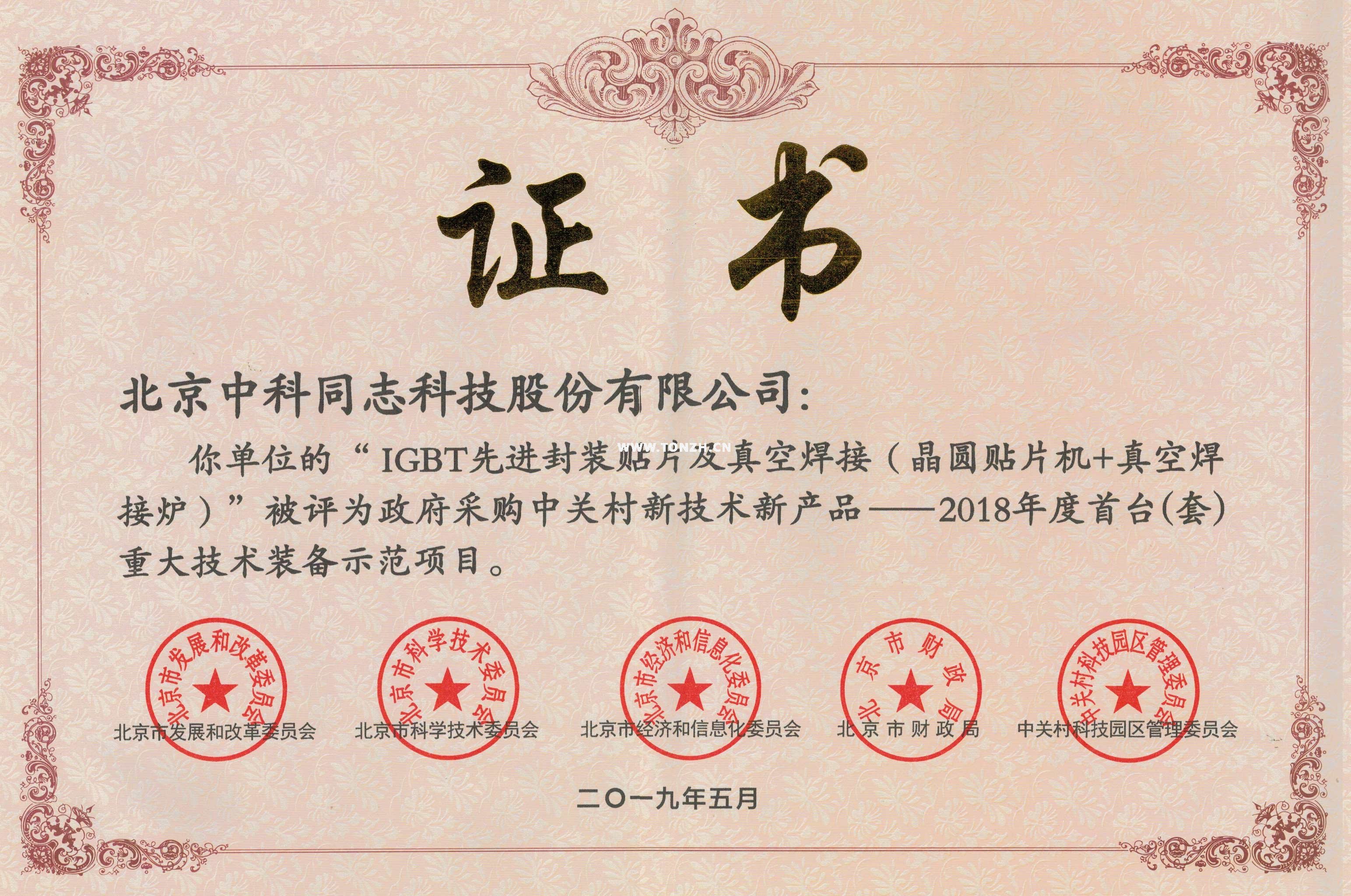 2019年度中关村国家自主创新示范区首台(套)重大技术装备示范项目技术评审工作已经结束,北京中科同志科技股份有限公司研制的“IGBT先进封装贴片及真空焊接”通过专家评审,被评为政府采购新技术新产品——2018年度首台(套)重大技术装备示范项目。