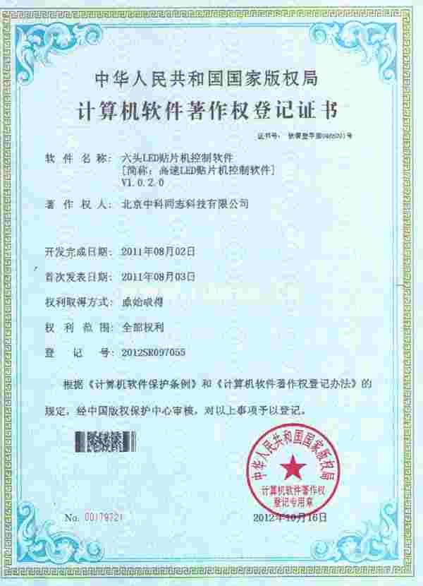 六头LED贴片机软件著作权证书