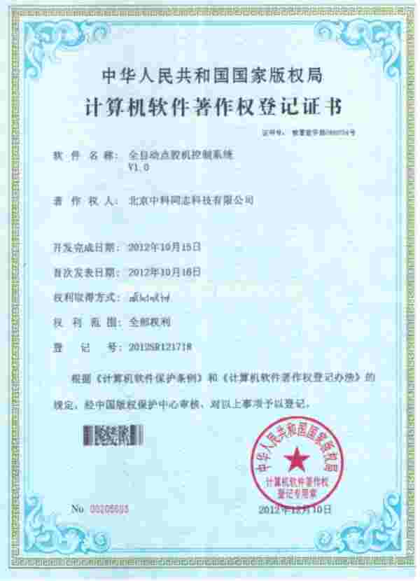 全自动点胶机控制软著作权证书