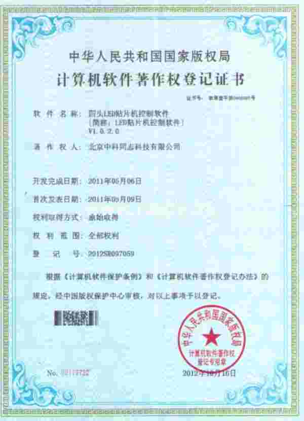 四头LED贴片机软件著作权证书