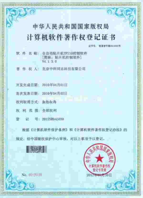 全自动视觉贴片机TP210软件著作权证书